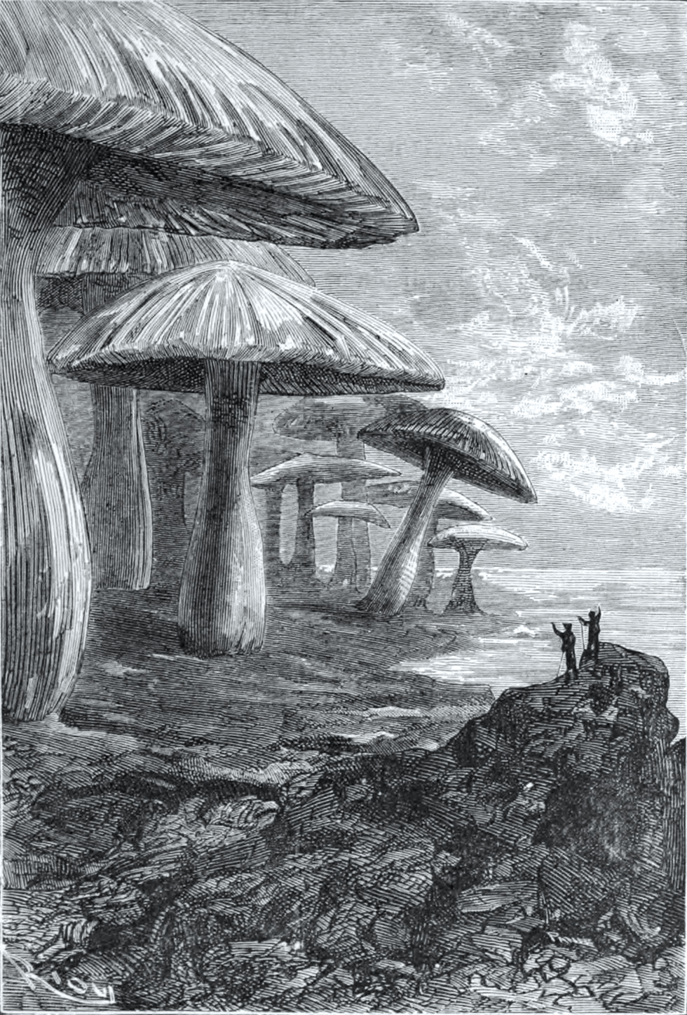 Mais j’aime cet album qui a quelque chose de plus que les autres. Premier épisode imprimé en couleur, il nous plonge immédiatement dans une atmosphère onirique. Le personnage qui déambule dans les rues aux premières pages, vêtu d’un drap de lit, frappant un gong en criant « C’est la fin du monde ! » alors qu’apparait la météorite dans le ciel, est pour moi l’holotype du gourou, du marchand de peur qu’il me semble dénoncer. Pas étonnant que les champignons trouvent leur place dans cette fable fantastique et scientifique, comme ils ont trouvé une place au centre de la Terre, sous forme de forêts fabuleuses, dans l’œuvre de Jules Verne.