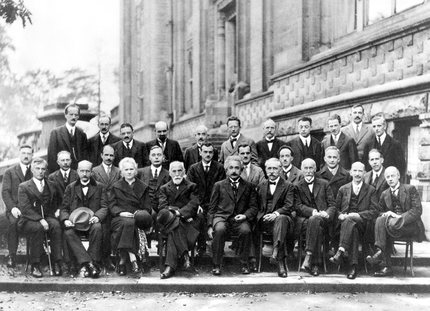 De gauche à droite : au dernier rang Auguste Piccard est en première position, Erwin Schrödinger à la 6e. Au deuxième rang Louis-Victor de Broglie est le 7e et inutile de situer Marie Curie et Albert Einstein au premier plan (cliché B. Couprie).